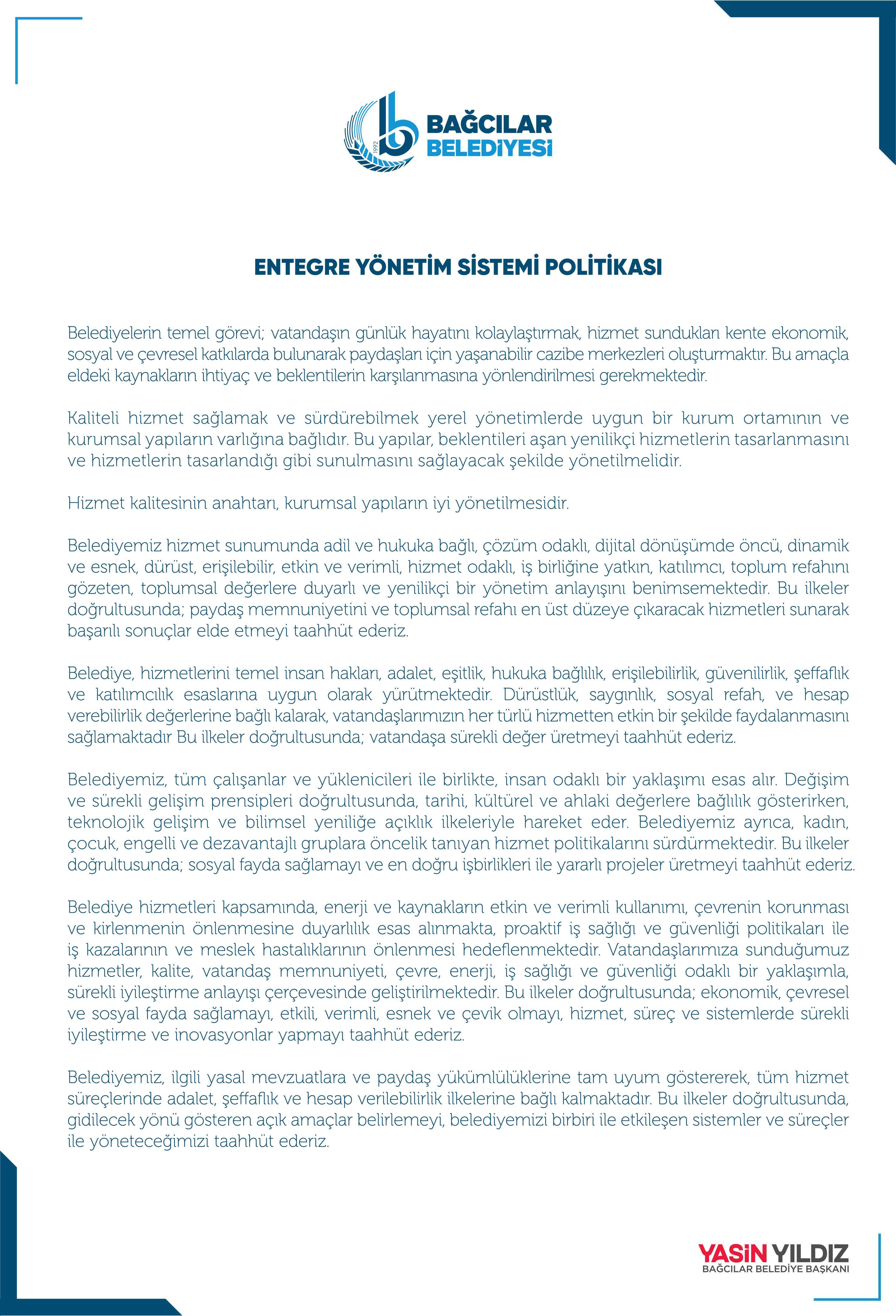 Belediye hizmetleri kapsamında, enerji ve kaynakların etkin ve verimli kullanımı, çevrenin korunması ve kirlenmenin önlenmesine duyarlılık esas alınmakta, proaktif iş sağlığı ve güvenliği politikaları ile iş kazalarının ve meslek hastalıklarının önlenmesi hedeflenmektedir. Vatandaşlarımıza sunduğumuz hizmetler, kalite, vatandaş memnuniyeti, çevre, enerji, iş sağlığı ve güvenliği odaklı bir yaklaşımla, sürekli iyileştirme anlayışı çerçevesinde geliştirilmektedir. Bu ilkeler doğrultusunda; ekonomik, çevresel ve sosyal fayda sağlamayı, etkili, verimli, esnek ve çevik olmayı, hizmet, süreç ve sistemlerde sürekli iyileştirme ve inovasyonlar yapmayı taahhüt ederiz.